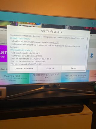 Televisor Samsung de 49 pulgadas, modelo UE49MU6405, en color negro. Incluye barra de sonido. Se entrega en Madrid en Caja de TV. - Modelo: UE49MU6405 - Número de serie: OD5R3HIJ401535F - Versión de software: T-KTMDEUC-1400.3, BT-S - Versión de Sub-micom: T-KTMINTV-1004 - Versión e-Manual: KTMDVBEUL-3.1.3