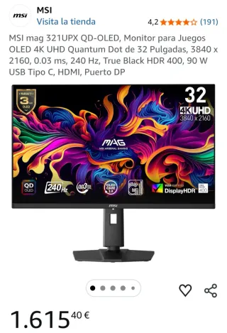 Monitor MSI MAG 321UPX QD-OLED de 32 pulgadas con resolución 4K UHD y tecnología Quantum Dot. Ideal para gaming y uso profesional. - Pantalla de 32 pulgadas. - Tecnología QD-OLED. - Resolución 4K UHD (3840 x 2160). - Tasa de refresco de 240 Hz. - Tiempo de respuesta de 0.03 ms. - True Black HDR 400. - Conexiones: USB Tipo C, HDMI, DisplayPort. Tengo la factura de compra ya que tiene garantia , busco cambio o por monitor un poco mas grande con similares características