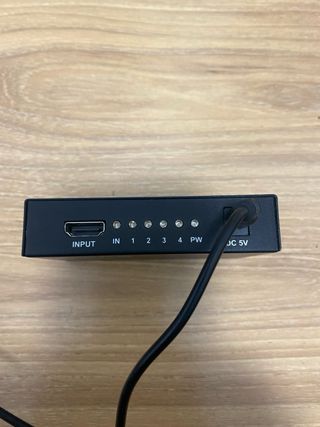 Divisor HDMI SANDA con 4 salidas para conectar hasta cuatro pantallas. -Indicador luminoso in/out y power. - Alimentador incluido. - Soporta resolución UHD 4K. - Modelo SD-3823.