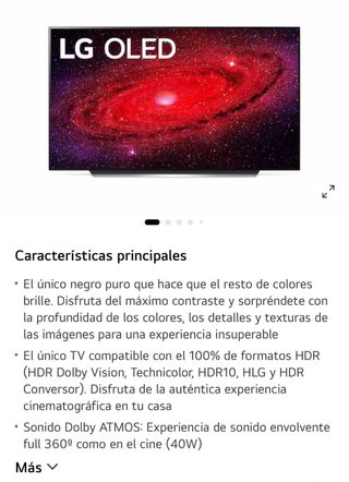 Vendo televisor LG OLED de 55 pulgadas, modelo OLED55CX5LB (gama alta), en perfecto estado de funcionamiento y estético. 🔹 Tecnología OLED (negros perfectos y calidad de imagen espectacular) 🔹 Resolución 4K 🔹 Ideal para cine, series y gaming 🔹 Sin quemados, sin marcas, sin fallos 🔹 Siempre usado en entorno doméstico 🔹 Con peana original, estable y en muy buen estado 🔹 Mando original incluido 📌 No dispongo de la caja original (precio ajustado por ello). Se puede ver y probar sin problema. Entrega en mano, no hago envíos por tratarse de una TV. Televisor LG OLED de 55 pulgadas en color negro. Ofrece una experiencia visual inmersiv