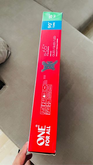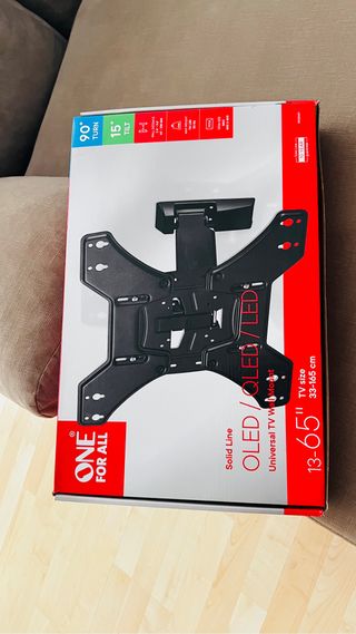 SOPORTE UNIVERSAL PARA PARED Soporte de Pared para TV 32-65" Inclinación ajustable para evitar reflejos Este soporte de televisor Ultra Slim de One For All con inclinación ajustable de hasta 15º es adecuado para pantallas de entre 32 y 65 pulgadas. One For All ofrece una amplia gama de soportes para todas las marcas de Televisores Los soportes de pared One For All son aptos para todo tipo de televisores (LED, LCD, Plasma) de cualquier marca, tamaño y dimensiones VESA. Resumen el Producto Soporte de Pared Inclinable Para TVs de 32-65" 15° Inclinación Materiales para la instalación incluidos App para fácil instalación