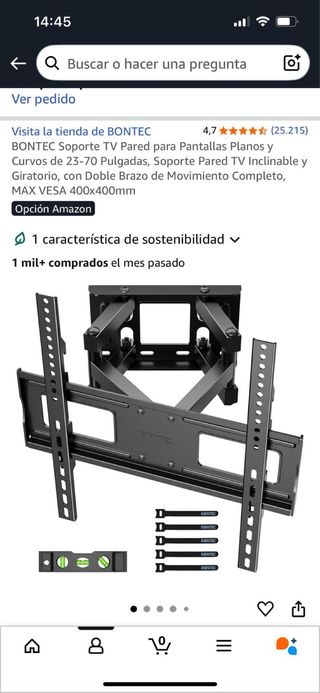 Soporte de pared para televisores planos y curvos. - Compatible con pantallas de 23 a 70 pulgadas. - Permite inclinación y giro. - Doble brazo para movimiento completo. - Soporta VESA hasta 400x400mm. - Incluye nivel y cintas de sujeción.