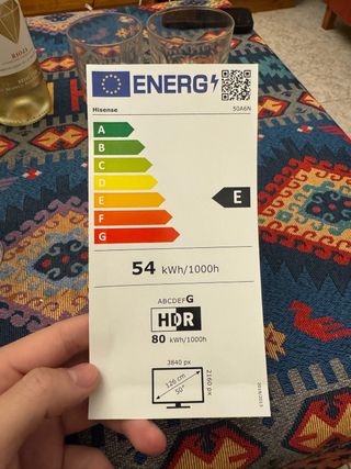 Televisión Hisense de 50 pulgadas con resolución 4K y HDR. Eficiencia energética clase E. - Tamaño de pantalla: 50 pulgadas (126 cm). - Resolución: 3840 x 2160 píxeles. - Soporte HDR. - Consumo energético: 54 kWh/1000h (estándar), 80 kWh/1000h (HDR).