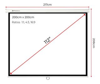 Pantalla de proyector de 112 pulgadas con unas dimensiones de 200cm x 200cm. Admite relaciones de aspecto 1:1, 4:3 y 16:9. - Tamaño diagonal: 112 - Dimensiones de la pantalla: 200cm x 200cm - Relaciones de aspecto: 1:1, 4:3, 16:9 - Ancho total: 217cm - Alto total: 208cm