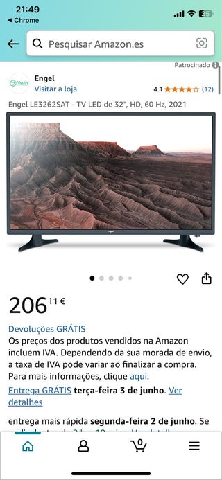 Marca Engel. Modelo LE 3220 C. Led Tv. No es Smart TV. Va en su caja, algo sucia por estar guardada. Solo le falta los tres tornillos de agarre de la televisión a la peana, pero es cuestión de hacerse con ellos. Funciona perfectamente, usada un par de meses y luego ha estado guardada en su caja, tras una mudanza. Contiene el mando a distancia y manual de instrucciones. En la foto puede verse los conectores que trae.
