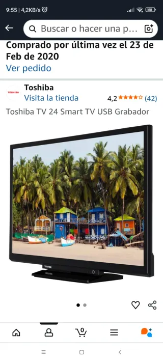 Televisor Smart TV Toshiba de 24 pulgadas con resolución Full HD. Ideal para disfrutar de tus contenidos favoritos. - Tecnología de pantalla LED. - Resolución 1080p. - Función internet. - Conectividad USB.tiene 5 años del año 2020 y con 2 mandos uno nuevo sin estrenar
