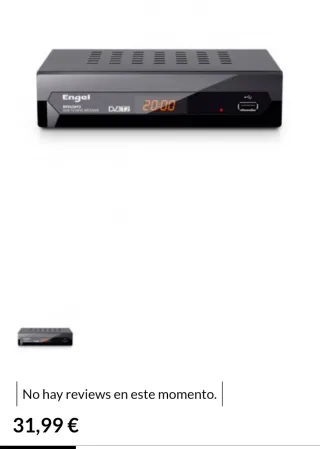 El precio mostrado es el de venta en nuestra tienda. El precio de este producto en nuestra página web puede ser diferente. Este artículo está disponible en nuestra tienda de Alcalá de Henares. sintonizador tdt engel rt5130t2 CC094_E77260_0 es un objeto que se ofrece en estado muy bueno. Todos nuestros productos cuentan con garantía de 3 años y un plazo de devolución de 14 días. Disco duro interno: No | Tipo tdt: Tdt 2 | Marca: Engel | Modelo: Rt5130t2 | Modalidad: Fijo | Hdmi: 1 | Mando a distancia: No | Ranura tarjeta de memoria: No | Timeshift: No | Compatible con full hd: Si | Receptor: No | Grabador: No | Usb: 1. Precio