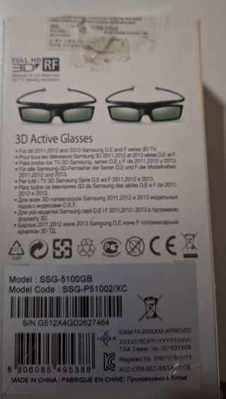 Gafas 3D activas Samsung, modelo SSG-P51002. Se incluyen dos gafas en el paquete. Son de color negro y están en buen estado. - Full HD 3D RF. - Compatible con Smart TV Samsung. - Tipo de batería. CR2025 (Tengo otras 2 de otro modelo a la venta en mi perfil.)