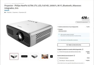 Vendo proyector Philips NeoPix Ultra 2TV en perfecto estado. Es de color gris plata y tiene un diseño elegante y compacto. - Full HD, 2000 h - Wi-Fi y Bluetooth - Altavoces integrados