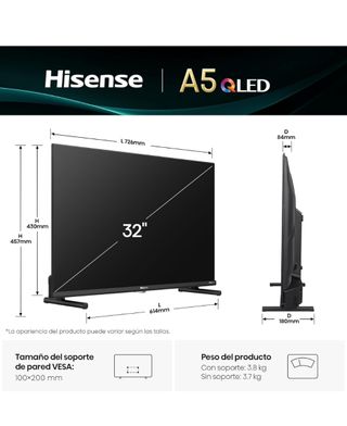 Televisor Hisense 32A5Q de 32 pulgadas, prácticamente nuevo. - Tecnología QLED para colores vibrantes. - Resolución FHD (Full HD). - Dispone de HDR 10 para un mejor rango dinámico. - Permite una doble posición.