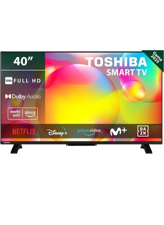 Televisor Toshiba 40LV2463DG de 40 pulgadas, con una pantalla curva y elegante. Funciona con Alexa. - Resolución Full HD 1080p. - Smart TV con acceso a Netflix, Disney+, Prime Video, y más. - Dispone de sonido Dolby Audio.
