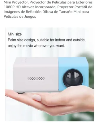 Mini proyector portátil con altavoz incorporado, ideal para exteriores y películas. - Resolución 1080P HD. - Imágenes de reflexión difusa. - Tamaño mini. - Incluye control remoto y cable de conexión.