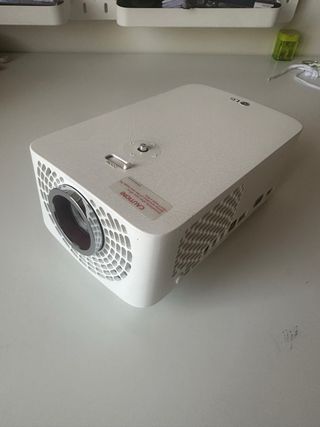 Mini proyector LG MiniBean PH150G. Poco usado y muy bien cuidado. - Con batería integrada de hasta 2,5h de autonomía. - Screen Share para transferir y proyectar inalámbricamente desde Smartphones y tablets. - Altavoz integrado. - Bluetooth para transmitir a equipos de sonido (compatible con Dolby digital plus). - Conexiones: puerto DC IN, USB, HDMI MHL y toma de auriculares. - Tencología LED (30.000 horas de vida útil). - Resolución HD (1280x720P). - 130 lúmenes. - Hasta 100 pulgadas. - Incluye mando a distancia, cable de alimentación, manual y soporte para trípode.