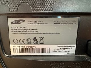 Monitor Samsung de 23 pulgadas con resolución Full HD. Fabricado en Rumanía en octubre de 2009. - Modelo: CF23MS - Código de modelo: LS23CFVKF/EN - Voltaje: AC100-240V~ 50/60Hz 1.0A - Número de serie: CF23H9XSA02675W Funciona perfectamente. La pantalla no tiene píxeles muertos ni rayones. Incluye el mando a distancia original (aunque falta la tapa) y el cable de corriente.