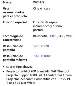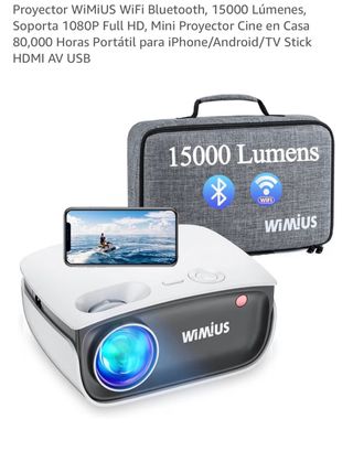 Proyector WiMiUS con conexión WiFi y Bluetooth, ideal para cine en casa. Soporta Full HD 1080P y tiene una larga vida útil de 80,000 horas. - Conectividad WiFi y Bluetooth. - Soporte para iPhone/Android/TV Stick. - Puertos HDMI, AV y USB.