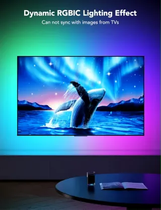 Luces inteligentes LED RGBIC de la marca Govee, 18W. Compatibles con Alexa y Google Assistant. Se puede controlar los tipos de luz con la aplicación Govee Home. 99 modos de escena y 11 de música. Incluye un micrófono incorporado, haciendo que el color y el brillo se sincronicen con la música. 3,8m puede cubrir fácilmente 4 lados de cualquier TV de 55-65 pulgadas.