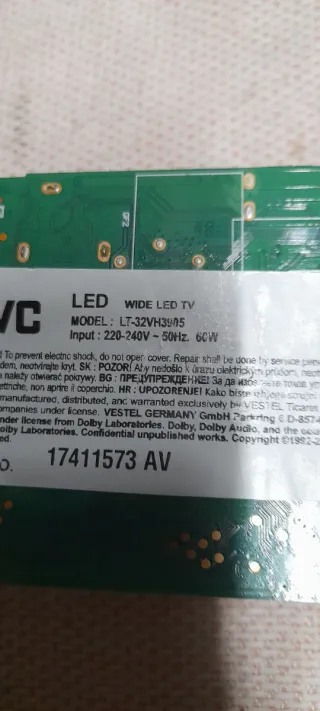 Placa base para TV LED JVC modelo LT-32VH3905. - Voltaje de entrada: 220-240V. - Frecuencia: 50Hz. - Consumo: 60W. -
