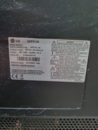 Televisión LG PLASMA 42 pulgadas, sirve para jugar o para piezas con mando original sin tapa trasera, funciona bien, no tiene tdt integrado, solo cuando está en negro se ven unos puntitos de colores. NO SE ENVIA