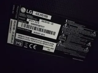 Televisor LG de 43 pulgadas. - Modelo: 43LH590V - Año de fabricación: Agosto 2016 - Código de producto: 43LH590V-ZD.BEUWLJG - Número de serie: 608WRSVL6766 - Ensamblado en Polonia.