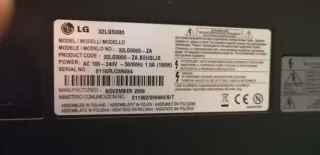 Televisor LG de 32 pulgadas. Modelo 32LG5000. - Fabricado en noviembre de 2008. - Ensamblado en Polonia. - Alimentación: AC 100-240V ~ 50/60Hz 1.5A (150W). - Código de producto: 32LG5000-ZA.BEUQLJG. - Número de serie: 811WRJC6N684.