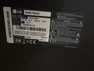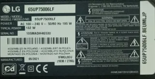 Televisor LG de 65 pulgadas, modelo 65UP75006LF. Pantalla no está rota dejo de funcionar seguro tarjeta de alimentación - Modelo: 65UP75006LF - Potencia: AC 100-240 V~50/60 Hz 195 W - Potencia típica: 132 W - Número de serie: 105MADH4G530 - Fabricado en: 05/2021