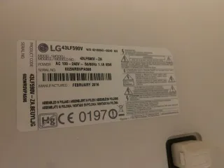 Televisión LG de 43 pulgadas en color gris, en muy buen estado. - Modelo: 43LF590V-ZA - Ensamblada en Polonia - Voltaje: AC 100-240V~50/60Hz 1.1A 65W