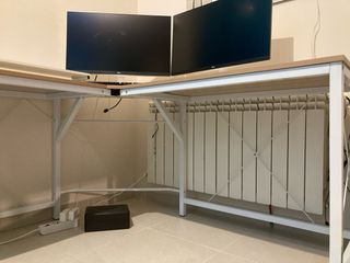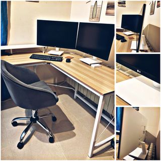 Se vende conjunto para oficina con dos monitores LG de 27 pulgadas, mesa de escritorio y silla de oficina. - Dos monitores LG de 27 pulgadas. - Mesa de escritorio con superficie de madera y estructura metálica. - Silla de oficina giratoria con asiento y respaldo tapizados.