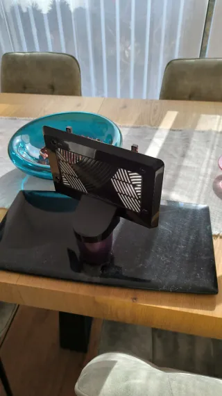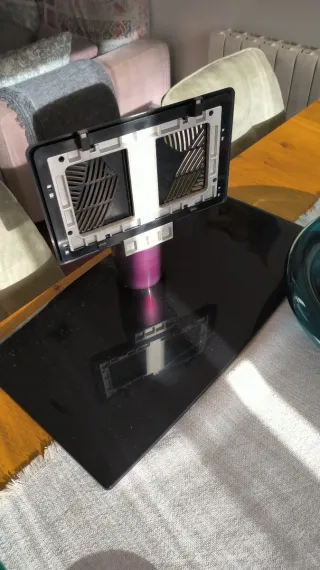 Base de repuesto para televisión LG. Fabricada en cristal negro brillante y metal. - Base de cristal negro. - Soporte metálico con acabado morado.para LG pertenece a una pa talla 42 pulgadas LE42 5500 ZA