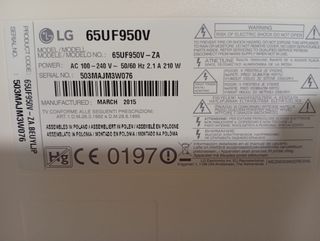 Televisor LG de 65 pulgadas en perfecto estado. Modelo 65UF950V. Se puede entregar en Granada también - Pantalla de 65 pulgadas. - Resolución 4K UHD. - Smart TV con acceso a aplicaciones. - Conectividad HDMI y USB.