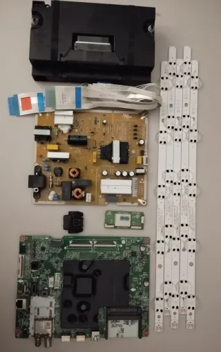 Componentes electrónicos para televisor LG 43UQ81006LB. - placa madre EAX69581205(1.0) - Placa de fuente de alimentacion - Tiras de LED para retroiluminación. - botonero - Cableado de conexión. - altavoces