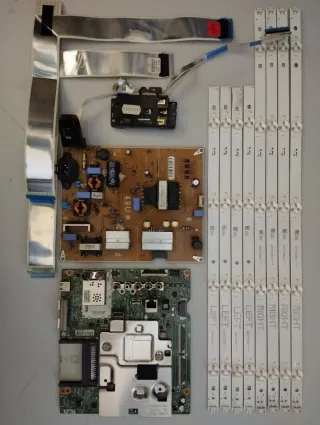 Componentes de repuesto para TV LG 43UQ751COLF. - Placa principal (main board) EAX69830902(1.1). - Placa de fuente de alimentación. - Tiras LED (4 unidades). - Cables flex de conexión. - botonero - módulo wifi