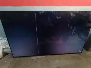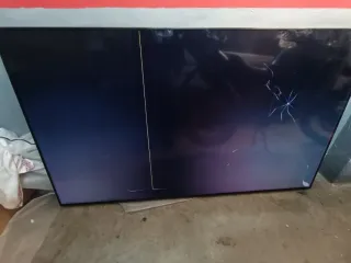 Televisión LG de 65 pulgadas con el panel roto. La pantalla muestra líneas verticales y una grieta. - Modelo: LG 65 - Color: Negro