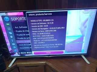 Televisor Smart TV LG de 40 pulgadas. - Modelo: 40UB800V-ZA - Versión de Software: 04.12.36 - Número de Serie: 409MAPN7L856 - MAC: CC:2D:8C:CF:97:C2 - Wi-Fi MAC: C8:02:10:3B:74:D6 - VSN: 1A57B6C3 YouTube, y todas las app