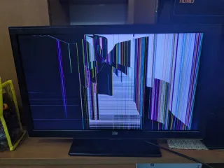 Televisión plana en color negro. - Pantalla con líneas verticales y horizontales de colores. - Marco negro.