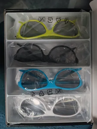 Conjunto de cinco gafas 3D en diferentes colores. - Gafas de color amarillo. - Gafas de color negro. - Gafas de color azul. - Gafas de color blanco.