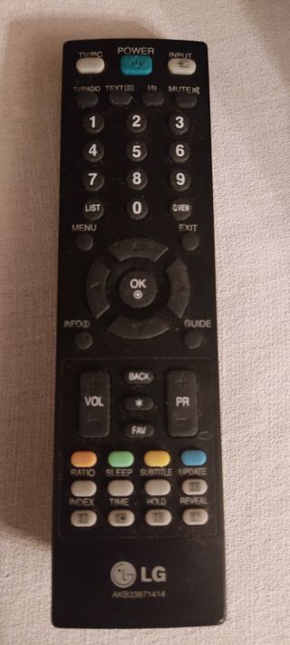 Mando a distancia para televisores LG. Incluye botones numéricos, de navegación y acceso rápido a aplicaciones. - Botón de encendido/apagado. - Teclas de volumen y canal. - Botones de colores en la parte inferior.