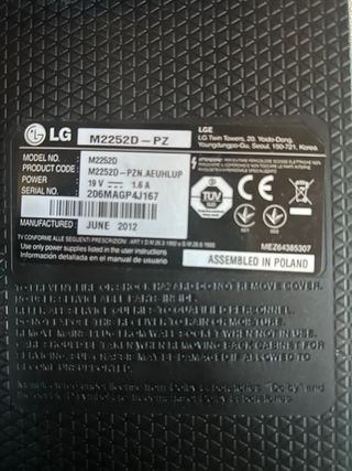 Monitor LG con función de televisión. - Pantalla LED HD. - Color negro. Fuente de alimentación nueva, falta mando a distancia pero normalmente no se usa mucho, se puede usar un mando universal, y con muchos smartphones nuevos crear el mando, funciona yo lo he conseguido así... De ahí su precio, por falta demanda a distancia.