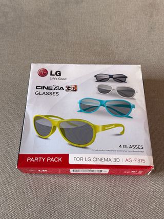 Pack de 4 gafas para disfrutar de películas y contenido en 3D con tu televisor LG Cinema 3D. Modelo AG-F315. - Incluye 4 gafas. - Diseño ligero y cómodo. - Ideales para fiestas y reuniones familiares.