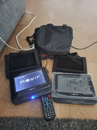Dos pantallas Nevir para coche o cualquier lugar, gracias a su apertura. Dimensión de pantalla de unos 17 cm diagonal Con cargador. Lector de DVD o USB