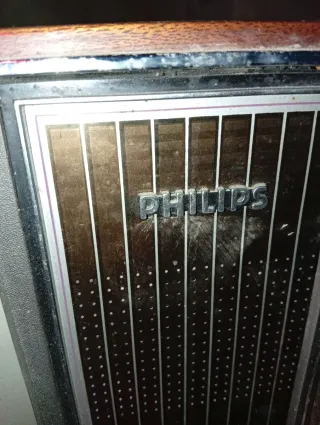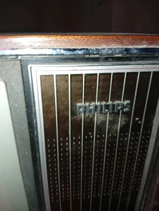 Televisión antigua de la marca Philips. Un diseño clásico que evoca nostalgia. - Marco en tono madera. - Panel frontal plateado con detalles verticales.