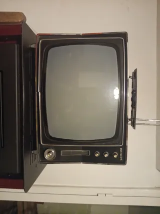 Televisor Philips vintage B/N – para reparar o decoración Televisor Philips antiguo en blanco y negro, ideal para coleccionistas, restauradores, atrezo, decoración vintage o proyectos retro. Estado: Enciende correctamente. Sintoniza, pero la imagen se colapsa en una línea horizontal (avería típica de la etapa vertical). La primera vez apareció nieve, ahora solo muestra la línea. No se ha reparado ni manipulado. Ideal para: Reparar (avería común y conocida en televisores CRT). Uso decorativo vintage. Escaparates, sets, atrezo, coleccionismo. Estado estético: bueno para su edad, con marcas normales del paso del tiempo. Entrega en mano
