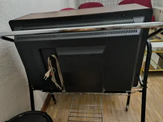 Tiene instalado un soporte de pared metálico ajustable (tipo VESA) con un brazo articulado y una perilla de ajuste manual. Control remoto: Se incluye el mando a distancia que cuenta con botones dedicados para funciones multimedia y navegación. Conectividad (Puertos traseros) 1 HDMI (ARC): Para dispositivos de alta definición. 1 SCART (Euroconector): Para equipos antiguos como reproductores de DVD o VHS. 1 VGA: Para conectar un ordenador (PC IN). 1 Salida de audio (óptica): Digital Audio Out. Entrada de antena: Coaxial de 75 \Omega. Entrada de audio: Jack de 3.5mm para VGA/DVI.