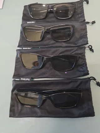Conjunto de gafas 3D de la marca Philips. - Incluye cuatro pares de gafas. - Cada par viene con su propia bolsa de protección.
