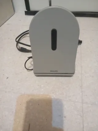 Antena portátil para televisión de la marca Philips. Su diseño es compacto y fácil de transportar. - Color gris. - Ranura negra vertical en el frontal. - Cable de conexión incluido.