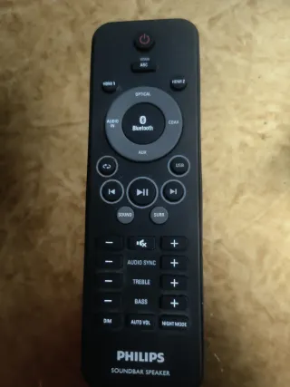 Mando a distancia para barra de sonido Philips. - Botón de encendido/apagado. - Selección de entrada: HDMI 1, HDMI 2, OPTICAL, AUDIO IN, COAX, AUX, USB, Bluetooth. - Controles de reproducción: Play/Pause, Anterior, Siguiente. - Botones de sonido: SOUND, SURR. - Ajustes de audio: Volumen, Audio Sync, Treble, Bass. - Funciones adicionales: DIM, AUTO VOL, NIGHT MODE.