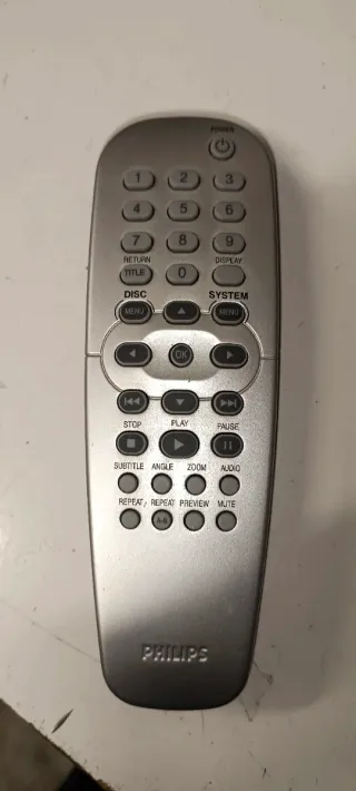 Mando a distancia plateado para reproductores de DVD de la marca Philips. Diseño ergonómico y fácil de usar. - Botones numéricos del 0 al 9. - Botones de navegación (arriba, abajo, izquierda, derecha, OK). - Botones de reproducción (play, pausa, stop, avance rápido, rebobinado). - Botones de menú (DISC, SYSTEM). - Botones de funciones (TITLE, RETURN, DISPLAY, SUBTITLE, ANGLE, ZOOM, AUDIO, REPEAT, MUTE). - Botón de encendido/apagado (POWER).