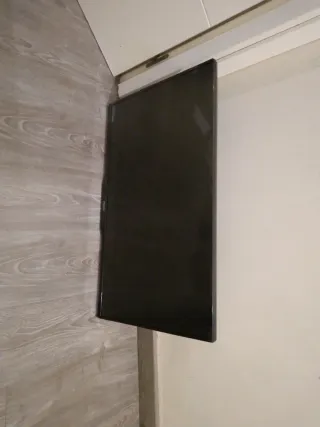 Televisor plano de pantalla negra. - Tamaño de pantalla: 70 cm x 30 cm (aprox. 30-32 pulgadas). - Estado funcional: Funciona perfectamente, sin fallos en la imagen. - Mando a distancia incluido. La base tiene algunos desperfectos estéticos (algunas marcas de uso), pero es totalmente estable y cumple su función.