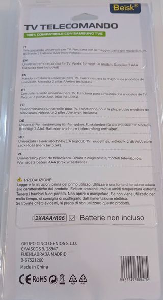 Mando a distancia valido para cualquier televisor SAMSUNG de PLASMA, LCD, LED, SMART TV, 4K, uso directo sin códigos, poner pilas y listo. Marca: BEISK Referencia: RM-L1090 Estado: Nuevo precintado Grantia: 2 años Aplicado el descuento sale por 3,90€.
