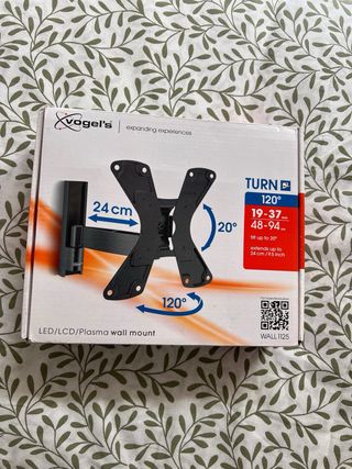 soporte TV led, LCD o plasma. para tamaño 19-37 pulgadas o 48-94cm angulo de giro 120º estado: nuevo en su caja original marca: vogel’s se compró en mediamarkt para una tv, y no se instaló nunca ya que no encajaba. Al haber pasado mas de un mes no nos dejaron devolverlo.