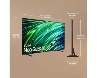 Televisor Samsung Neo QLED de 55 pulgadas con tecnología Mini LED y procesador de IA. - Ancho de pantalla: 1232.9 mm - Alto de pantalla (sin peana): 709.2 mm - Alto de pantalla (con peana): 765.7 mm - Fondo sin peana: 25.7 mm - Fondo con peana: 247.4 mm